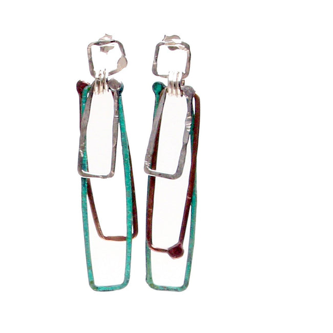 Mixed hammered polished Sterling silver and polished and patinated copper earrings in combinations of 3 elongated rectangular hoops.