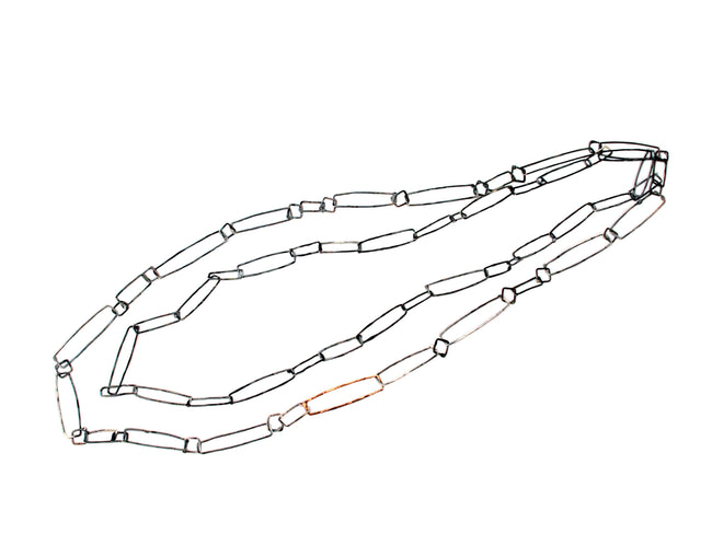 Mixed hammered oxidized Sterling silver with copper accents. Double strand in combinations of an elongated rectangular hoops and small squares.