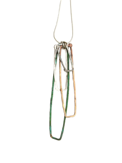 Mixed hammered polished and oxidized Sterling silver and polished and patinated copper pendant in combinations of 4 elongated rectangular hoops.