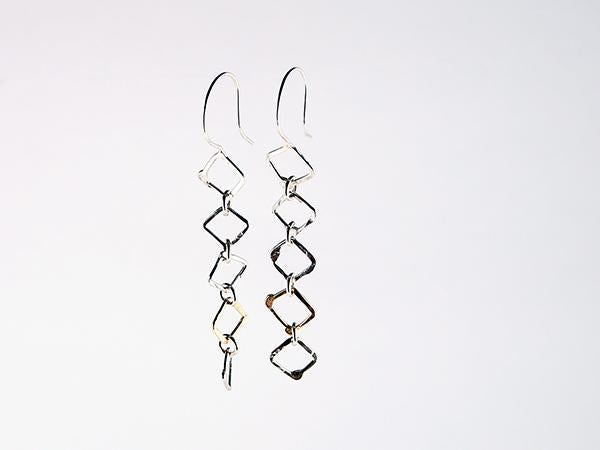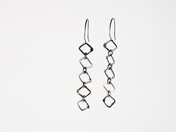 Hammered, polished, and oxidized black Sterling silver and 14K earrings in combinations of 5 squares suspended from a handcrafted Sterling silver hook.