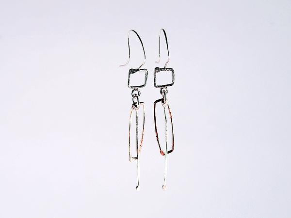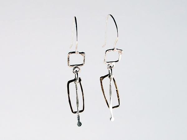 Hammered polished Sterling silver and 14K gold earrings in combinations of elongated 14K gold rectangular hoops and hammered Sterling silver wire "sticks" suspended from a handcrafted Sterling silver hook.
