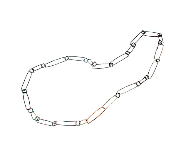 Mixed hammered oxidized Sterling silver with copper accents. Single strand in combinations of an elongated rectangular hoops and small squares.