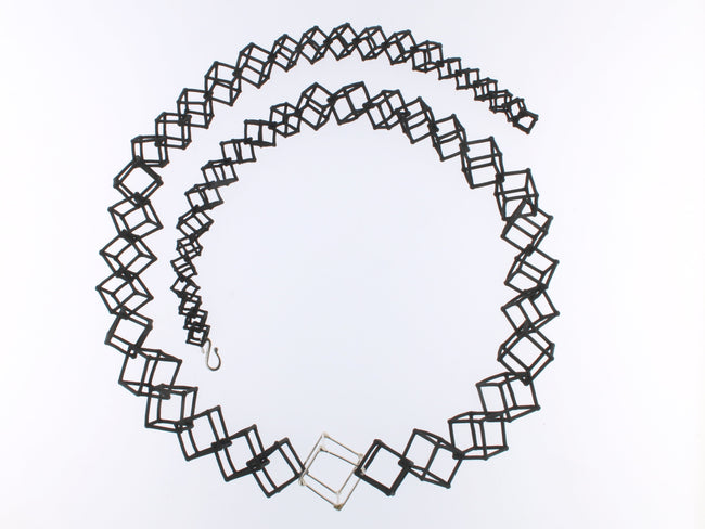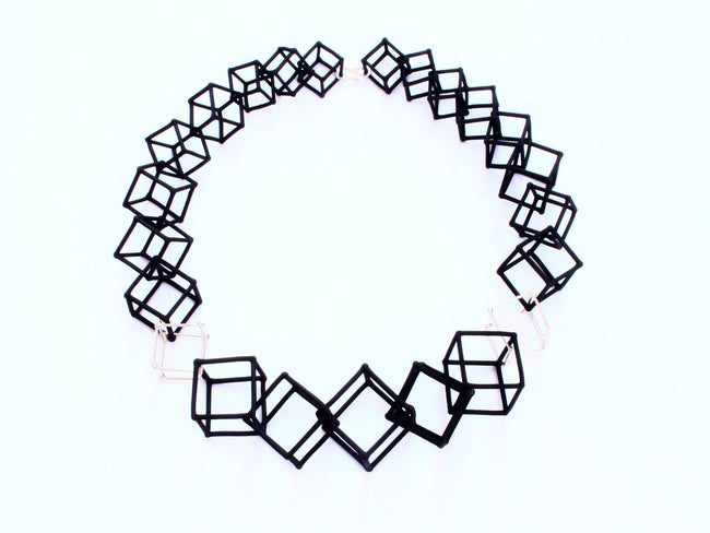 36" Cube Necklaces feature 3D printed hand dyed BLACK nylon cubes with handmade Sterling silver cube accents.