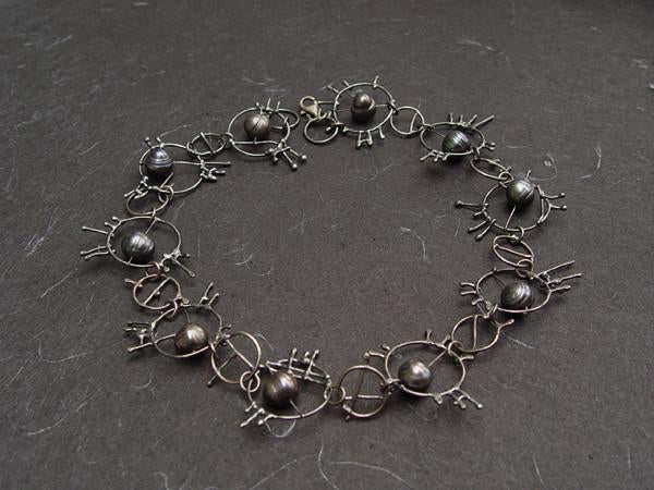 Pearl in wheel necklace, sculptural, hand made sliver wheels with coin pearls, available in lenghts 16" to 36", designed by Elizabete Ludviks