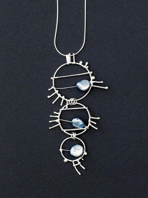 Pearl in wheel pendant, sculptural, hand made sliver wheel with coin pearl, cascading from large to small on snake chain, available in wheel sizes small to large, designed by Elizabete Ludviks