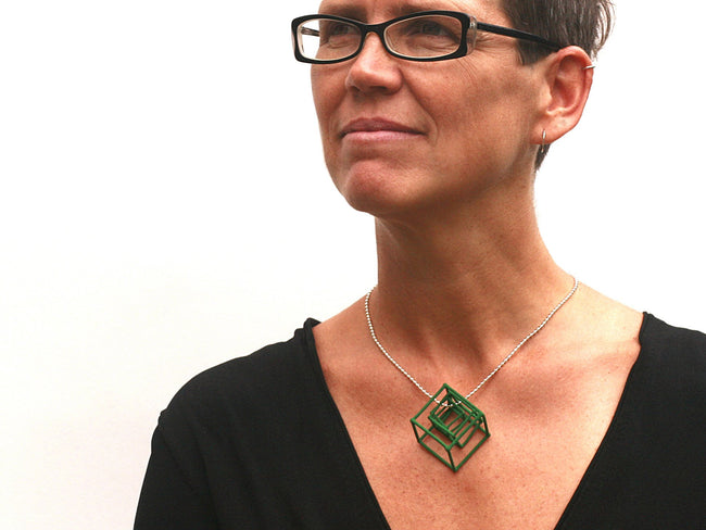 3D printed pendant, sculptural interlocking cubes, nesting cubes on sterling silver chain, made in light weight nylon, dyed, designed by Elizabete Ludviks