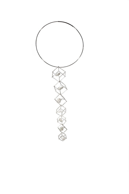 Cube & pearl pendant, sculptural, hand made sliver cubes with coin pearls, cascading from large to small on neck hoop, designed by Elizabete Ludviks