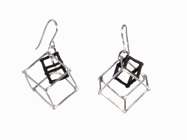 2 Cube earrings in handmade Sterling silver ("WHITE") with a 3D printed hand dyed BLACK nylon cube nesting inside.