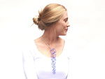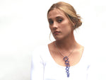 3D printed pendant, sculptural interlocking cubes, cascading cubes on sterling silver chain, made in light weight nylon, dyed, designed by Elizabete Ludviks, available from cube sizes small to large