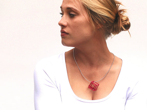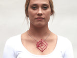 3D printed pendant, sculptural interlocking cubes, nesting cubes on sterling silver chain, made in light weight nylon, dyed, designed by Elizabete Ludviks, available in cube sizes x-small to xx-large