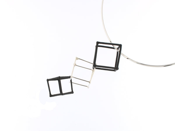 3 Cube cascading pendant with two 3D printed hand dyed black nylon cubes and a Sterling silver cube in between.
