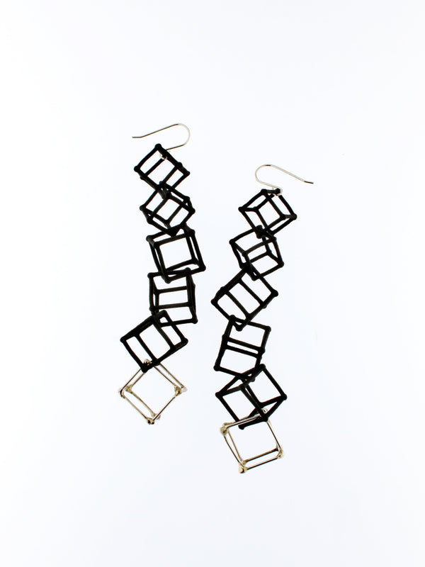 5 Cube cascading earrings with four 3D printed hand dyed BLACK nylon cubes and a handmade Sterling silver ("WHITE") cube.
