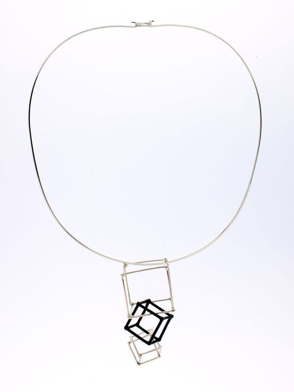 3 Cube cascading pendant with two Sterling silver ("WHITE") cubes and a 3D printed hand dyed BLACK nylon cube in between.