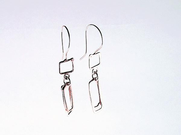 Hammered and polished earrings in combinations of 2 elongated rectangular hoops in Sterling silver (largest) and 14K gold (smallest) , suspended from a handcrafted Sterling silver square with ear hook.
