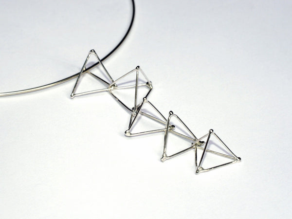 Sculptural handmade pendants with five cascading Sterling silver cubes.