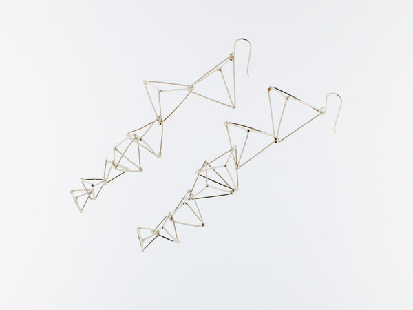 Sculptural handmade earrings with 7 cascading Sterling silver triangles.